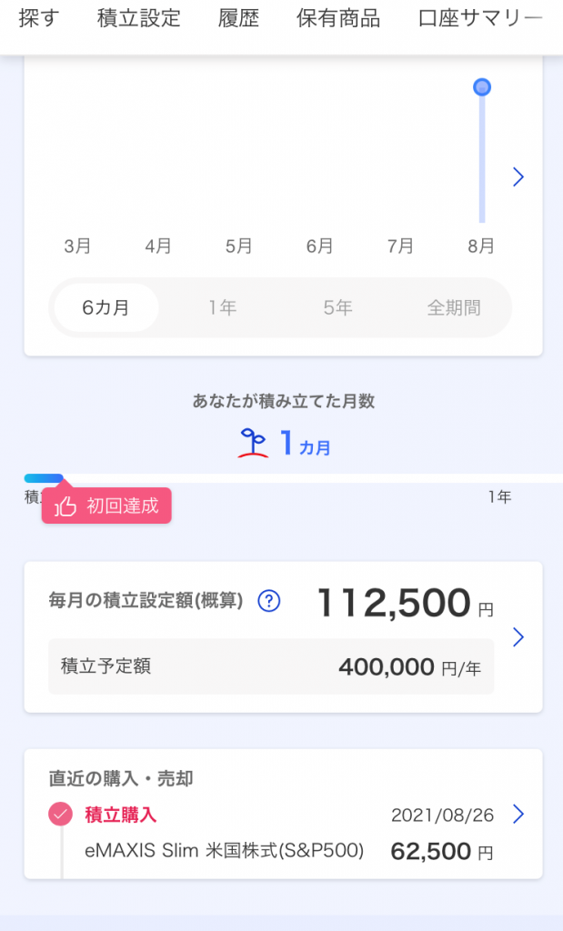 8月から開始したので1年間で40万円枠を使い切る為、分割計算で8月は62,500円の購入。